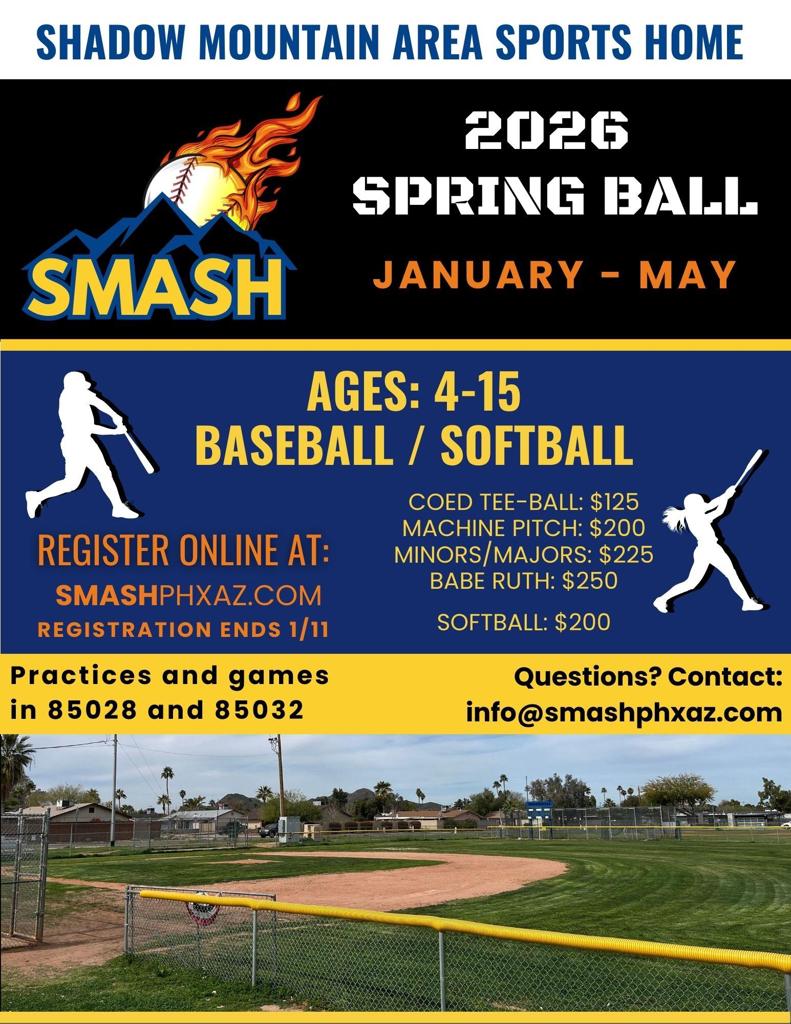 Shadow Mountain Area Sports Home (S.M.A.S.H.) is located in the heart of North Phoenix. Our community-based, nonprofit league is committed to providing players of all skill levels the best possible baseball and softball experience in a fun and supportive environment.